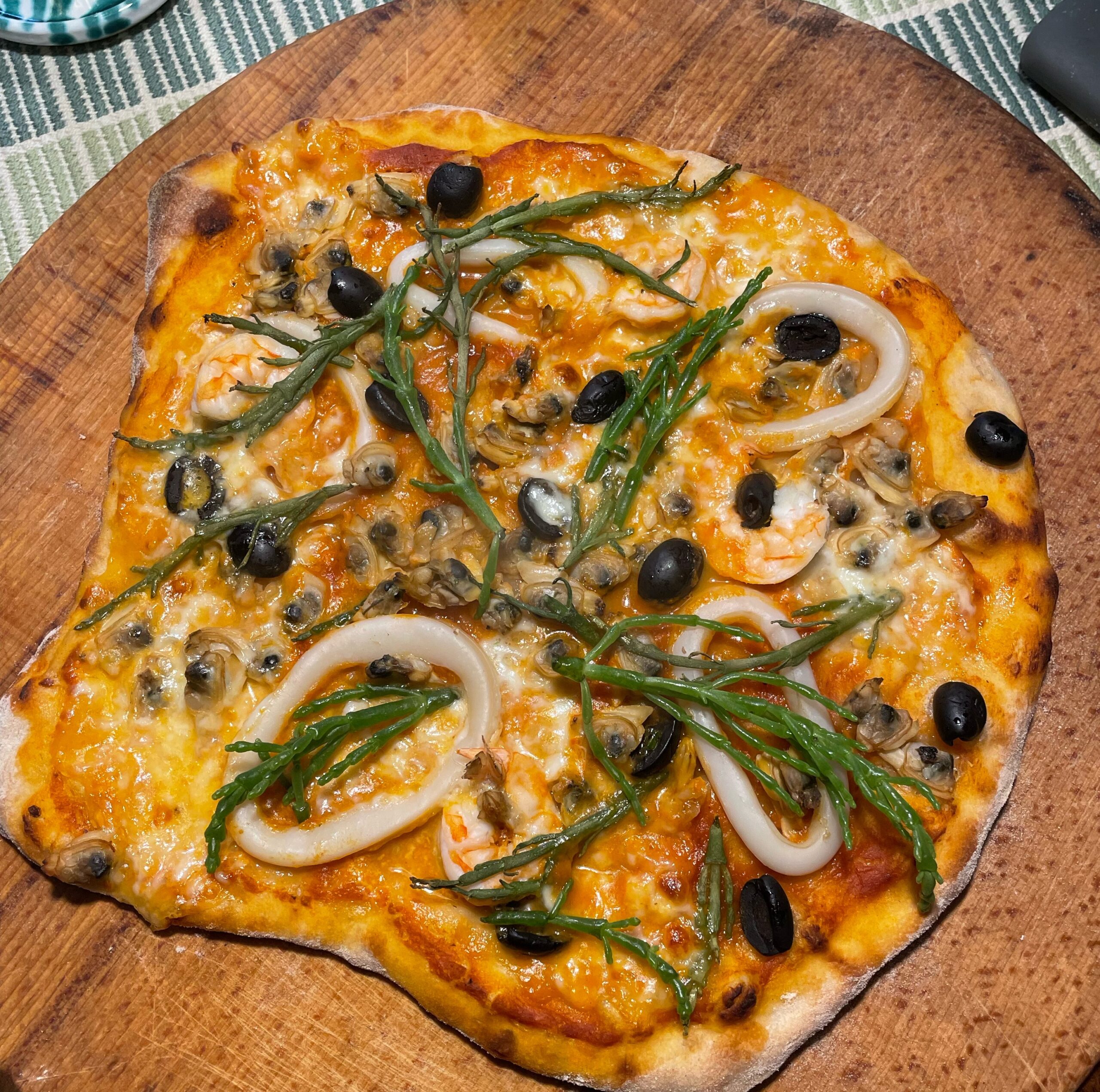 70 Stunden im Kühlschrank und das Ergebnis ist ein wirklich genialer Teig! Er lässt sich wunderbar verarbeiten und gleitet vom Einschiesser ohne Probleme auf den Pizzastein!( Dieses Mal nicht so wirklich rund 🤣) Auch mit dem relativ feuchten Frutti du Mare Belag entsteht eine knusprige Pizza ! Bei uns gab es die Version mit LM und Hefe, und gekochter Pizzaiola ( koche ich immer auf Vorrat in kleinen Gläsern aus unseren eigenen Tomaten ein)