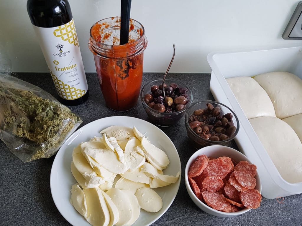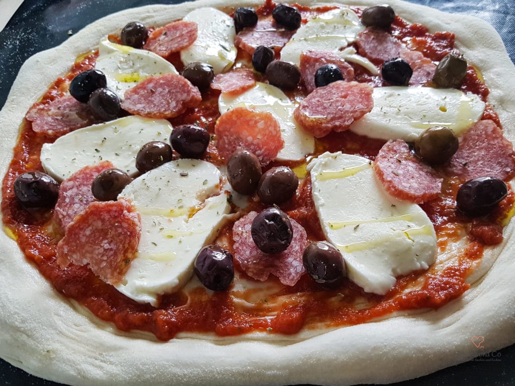 Zu viele verschiedene Zutaten wirken nicht nur überladen und sehen nicht so schön aus, sondern die Pizza lässt sich auch schlecht in den Ofen transportieren. Lieber wenige wirklich gute und möglichst frische Zutaten lassen Pizze (= Plural v. Pizza) erst wirklich gut werden. Wie bei Pizza Margaritha: Guter (Büffel-)Mozzarella, aromatische Tomaten, etwas frischer Basilikum. That’s it. Bei uns kommen eigentlich auch IMMER noch Oliven mit drauf, da dürfen es auch gerne ein paar mehr sein.