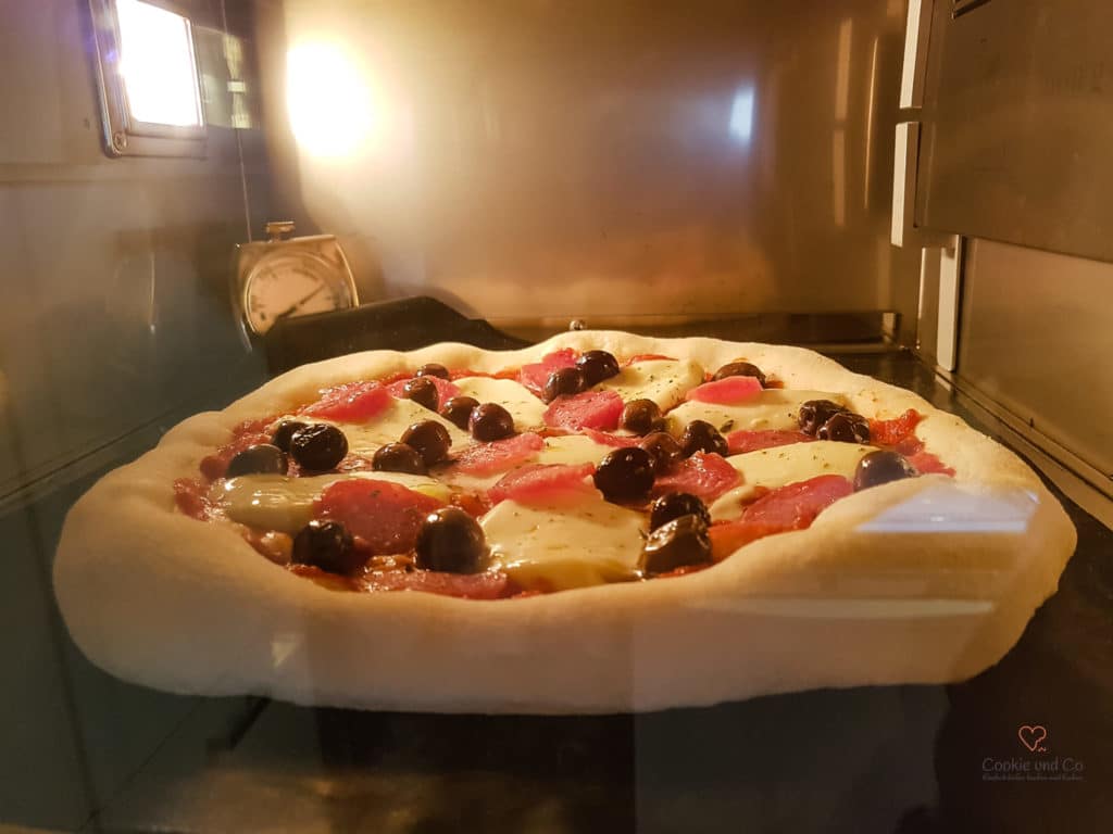 - Nach Belieben zusätzlich mit etwas Olivenöl beträufeln und eventuell mit getrocknetem Oregano bestreuen. (Frische Kräuter bitte erst nach dem backen auf die Pizza geben.)