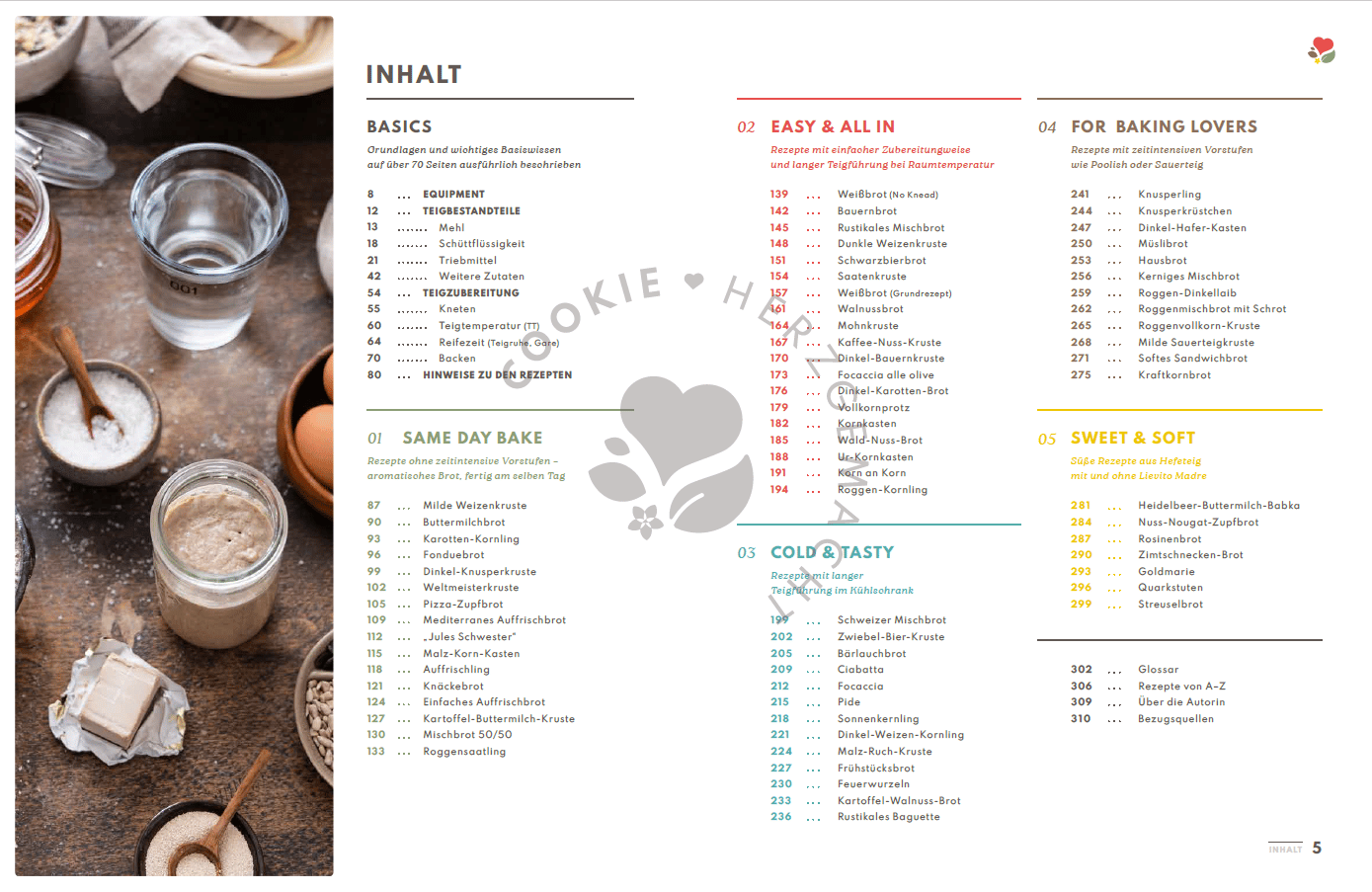 ♥ Grundwissen zum Nachschlagen, von den Teigzutaten über die Herstellung von verschiedenen Sauerteigen, bis hin zum Backprozess.