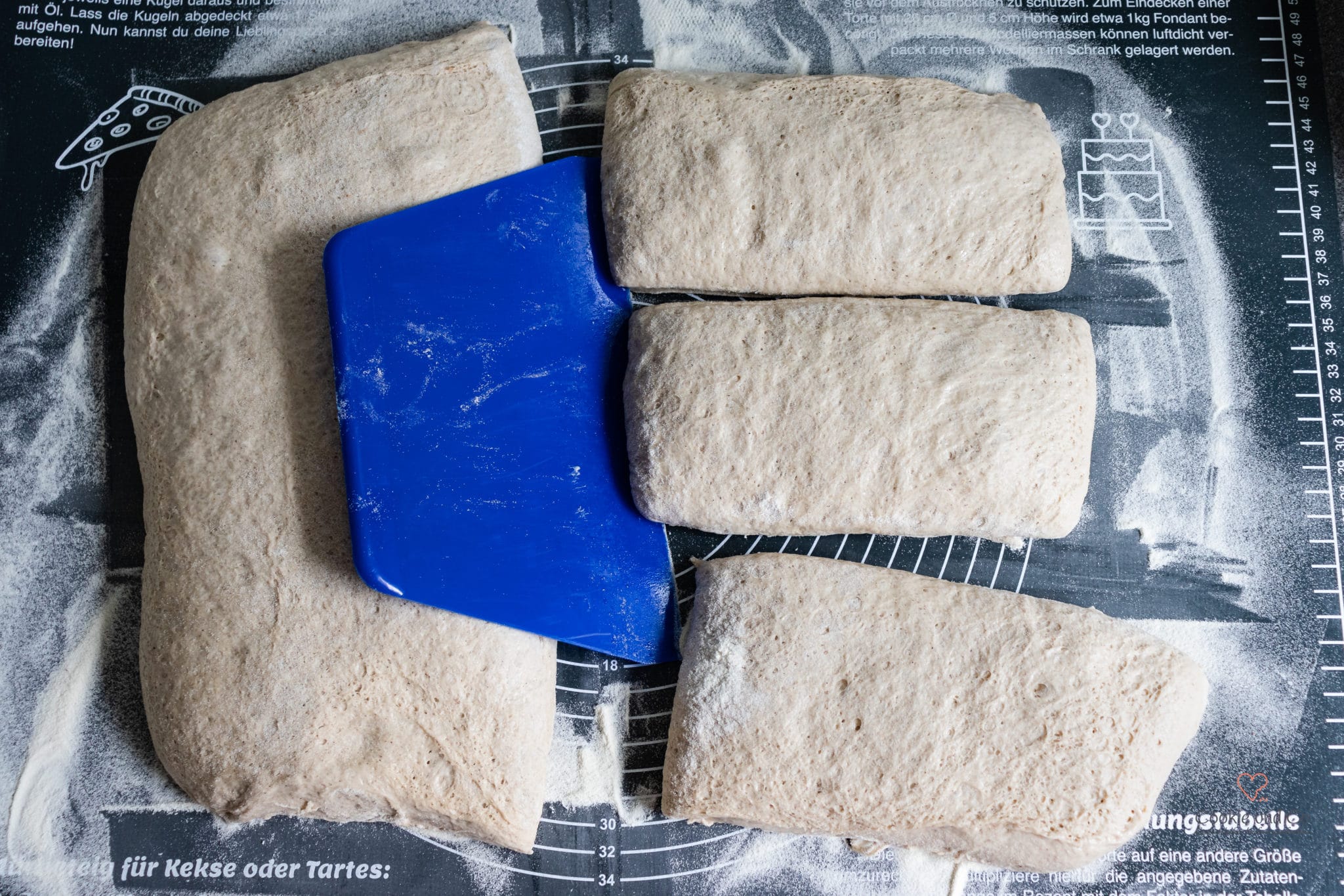 - Den Teig auf die leicht bemehlte Arbeitsfläche stürzen. Davon 3 rechteckige Teiglinge abstechen und schonend, aber mit etwas Spannung, zu Zylindern aufrollen.