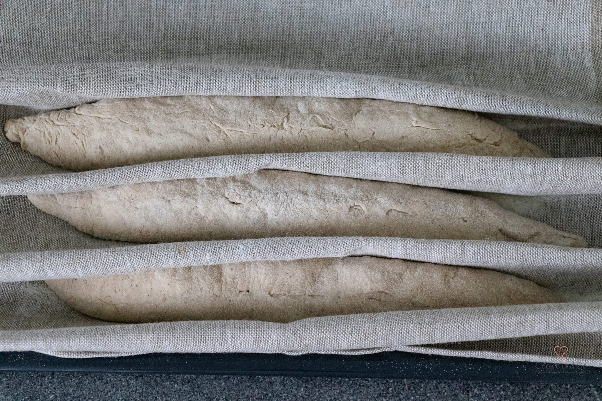 - Nun aus den vorgeformten Teiglingen schonend längliche Baguettes rollen.