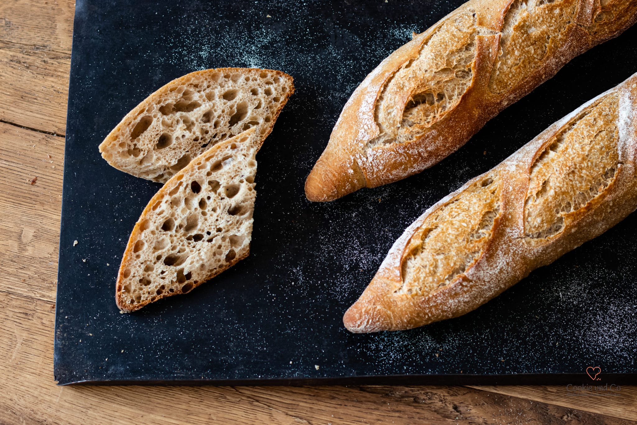 Für das rustikale Baguette habe ich zusätzlich noch einen T80-Anteil eingearbeitet für den rustikalen Touch. Ein etwas dunkleres auf Stein vermahlenes Mehl, ebenfalls mit dem Label Rouge Siegel zertifiziert. Herkömmliche passende Alternativen zu diesen französischen Mehlen habe ich dir bei den Zutaten angegeben. Für mich persönlich macht die Mehlqualität jedoch einen deutlichen Unterschied. Suchst du eher ein klassisches, ganz helles Baguette? Dann probiere doch mal mein „Baguette auf die einfache Art“.