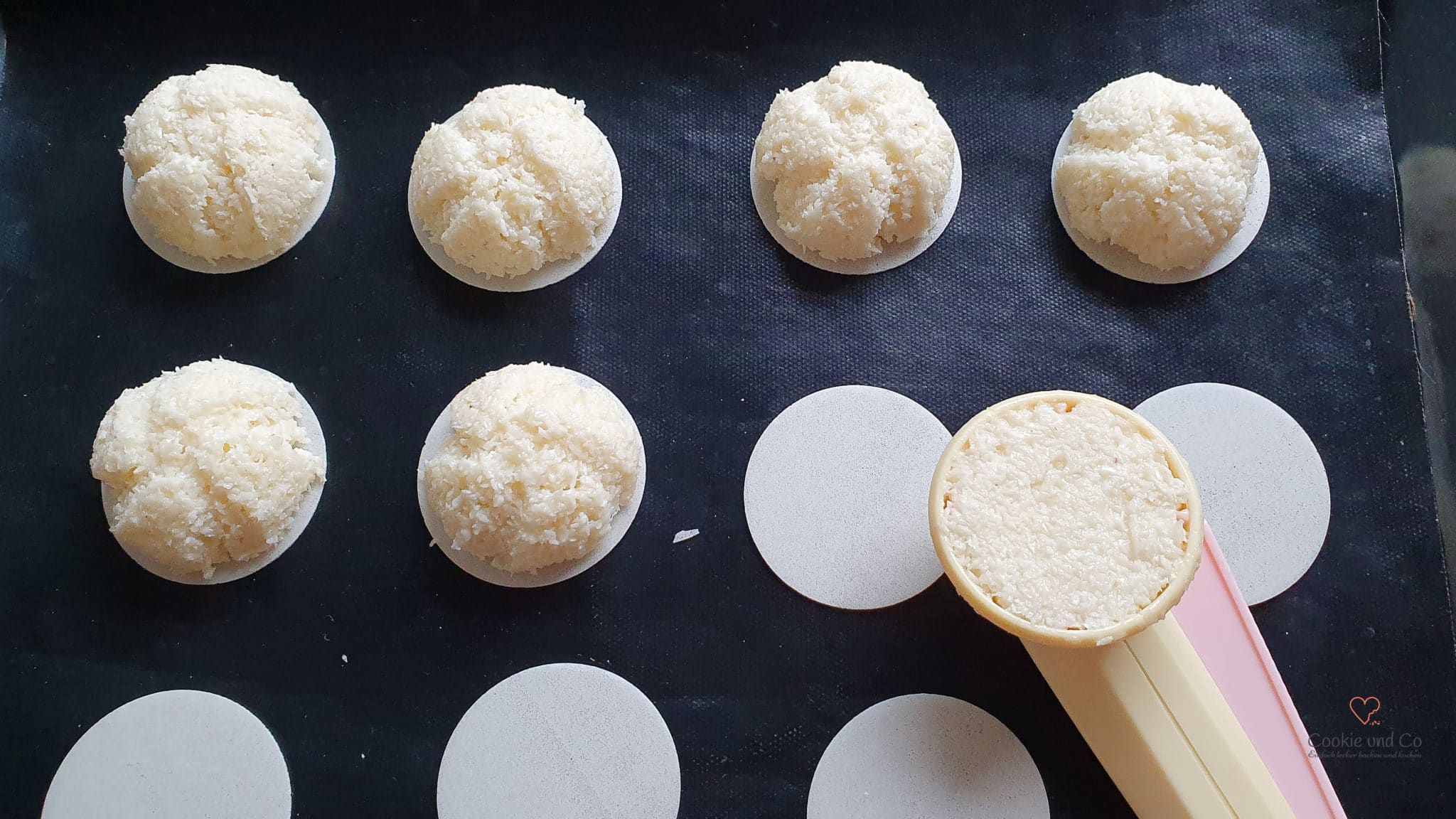 - Mit einem Makronator/ kleinen Eisportionierer oder mithilfe von 2 Teelöffeln die Masse auf die Backbleche/Oblaten portionieren.
