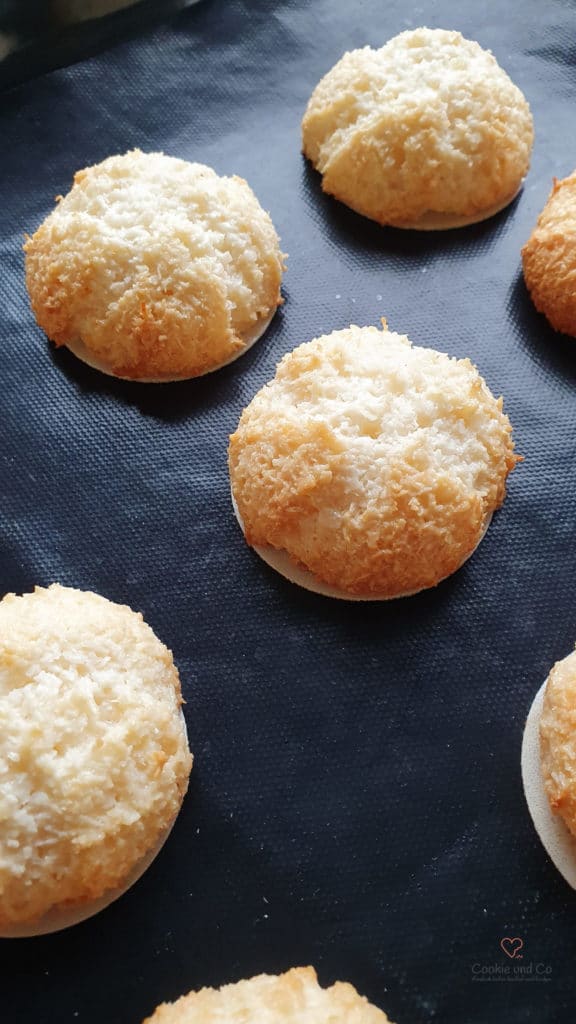 - Die Kokosmakronen bei 180° Ober-/Unterhitze oder 160 °C Heißluft für ca. 15 Minuten backen. Die Makronen sollten dabei am Rand anfangen zu bräunen.(Bei Ober-/Unterhitze müssen die Bleche nacheinander gebacken werden.) Anschließend abkühlen lassen.
