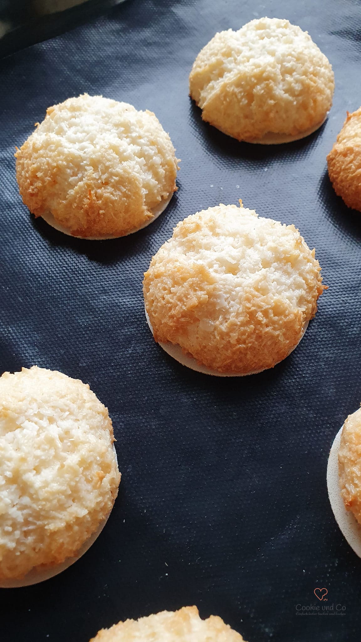 - Die Kokosmakronen bei 180° Ober-/Unterhitze oder 160 °C Heißluft für ca. 15 Minuten backen. Die Makronen sollten dabei am Rand anfangen zu bräunen. (Bei Ober-/Unterhitze müssen die Bleche nacheinander gebacken werden.)