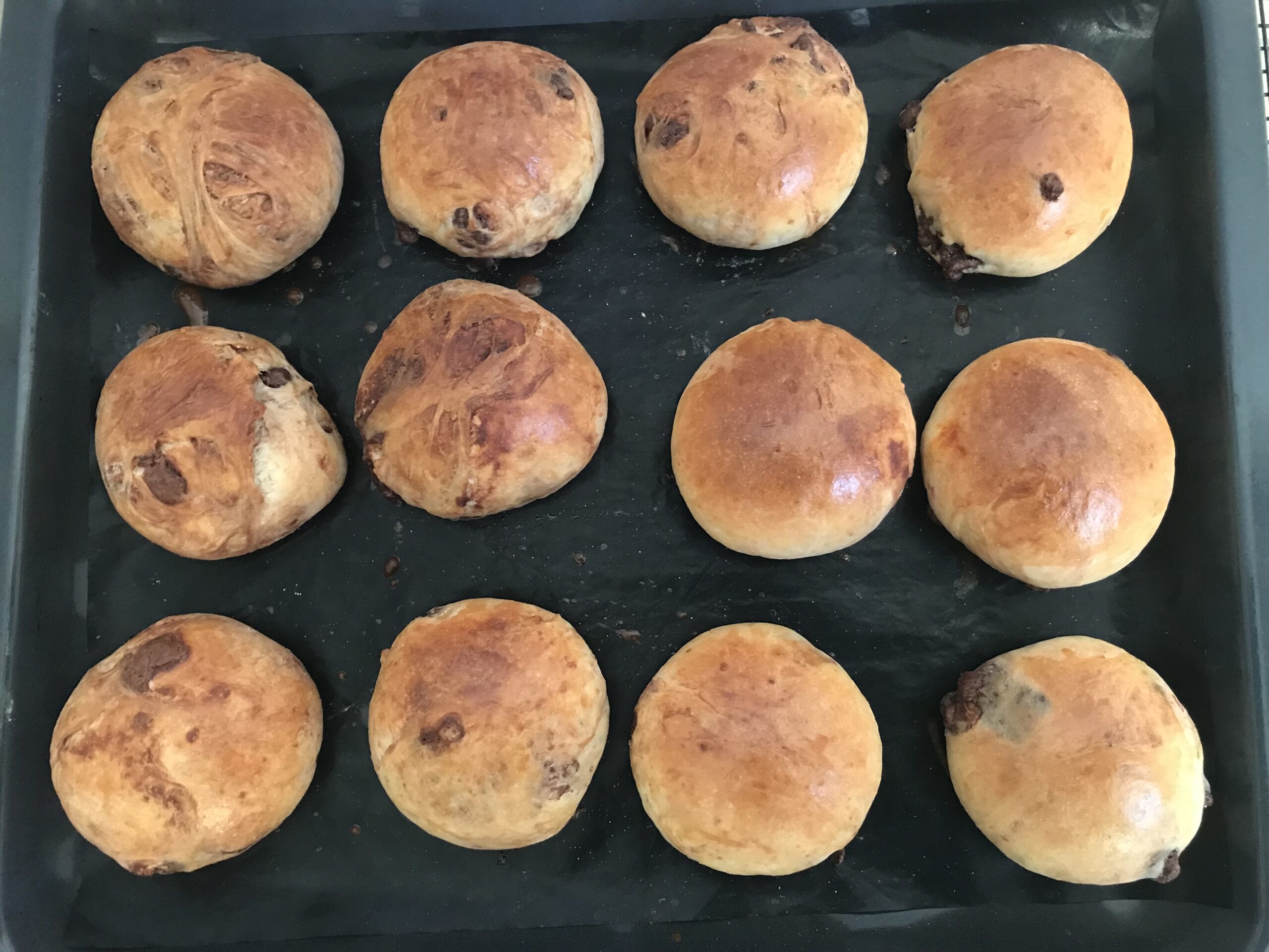 Das sind richtig tolle Brötchen! Ich habe sie mit eingeweichten Rosinen gemacht. Den Teig habe ich am Vortag mit 3g Hefe vormittags/mittags zubereitet, dann stand er bis nachmittags bei Zimmertemperatur, wurde dann geformt, kurze Stückgare im Raum und dann ca. 17:30 über Nacht im Kühlschrank. 30 Min akklimatisieren und bestrichen ab in den Ofen. Hat super geklappt und die Familie war begeistert.