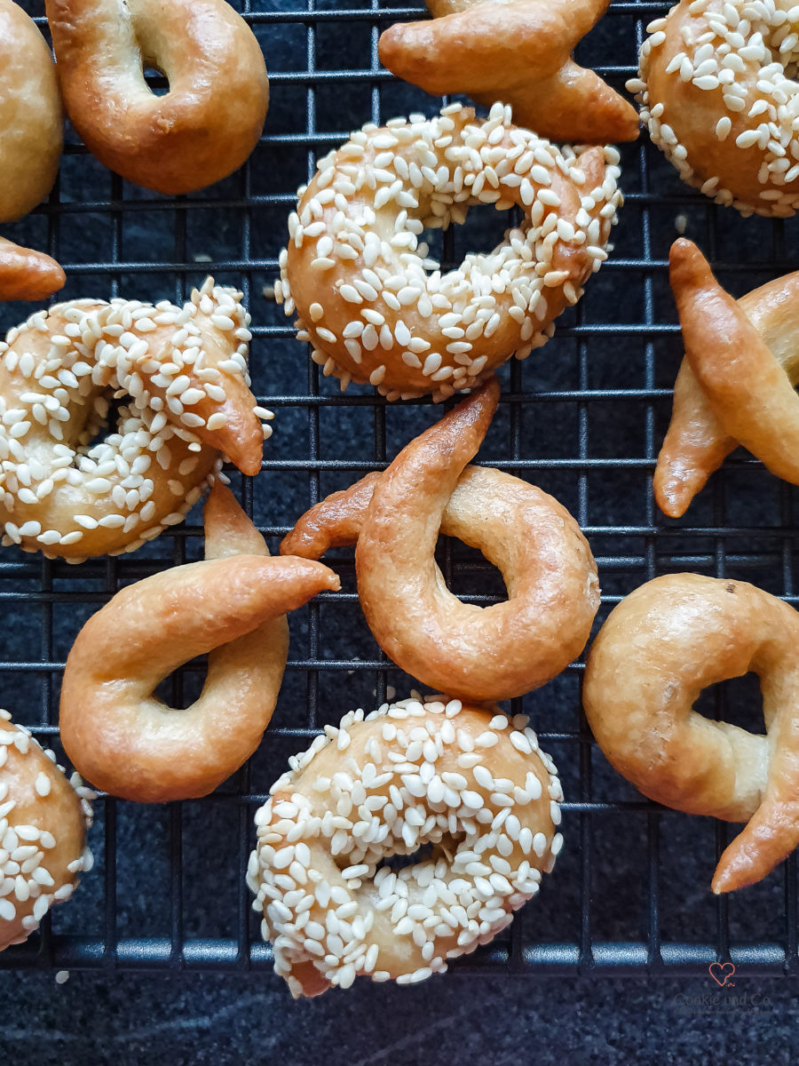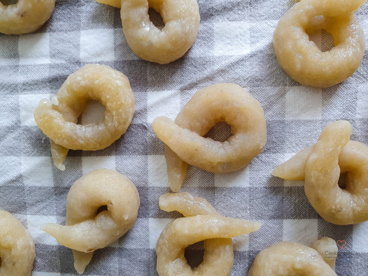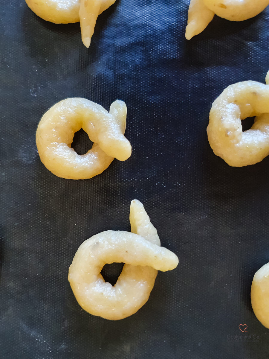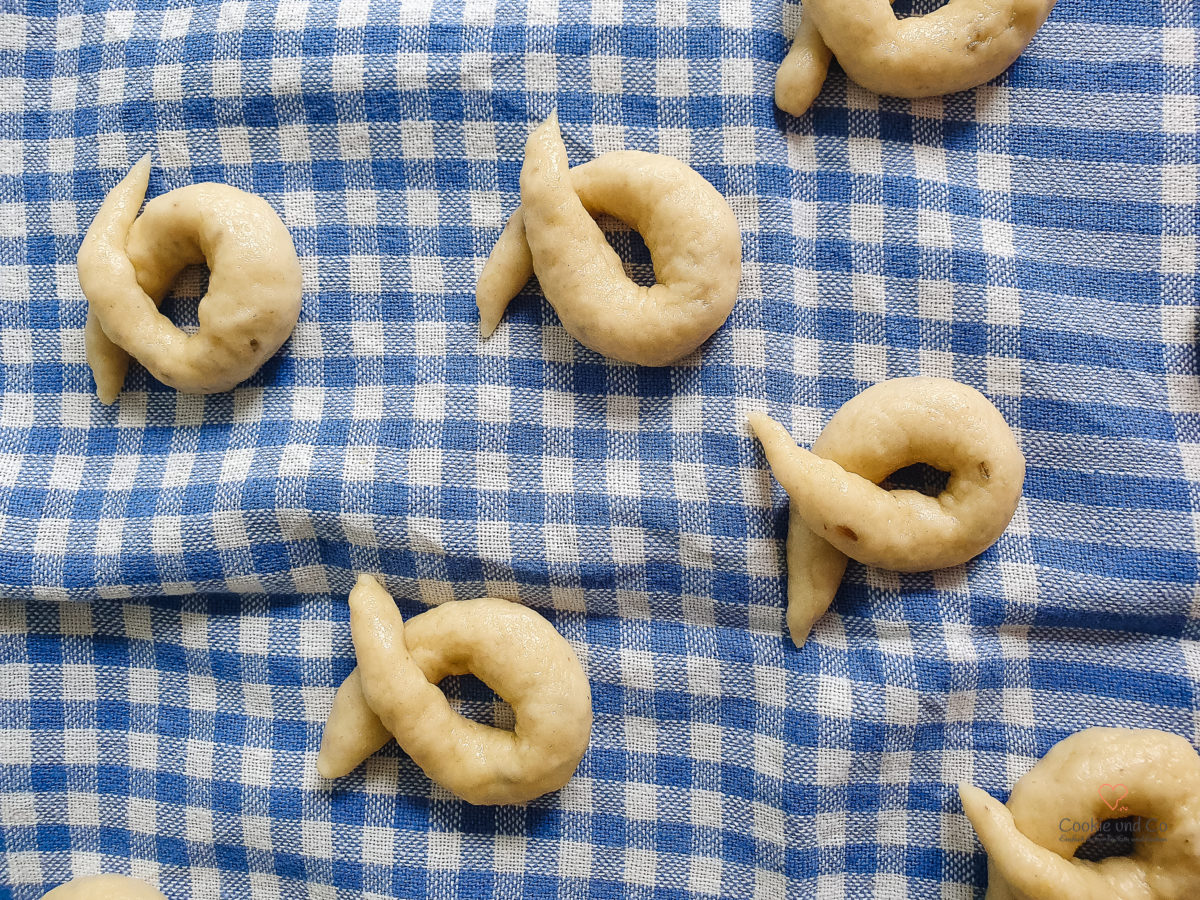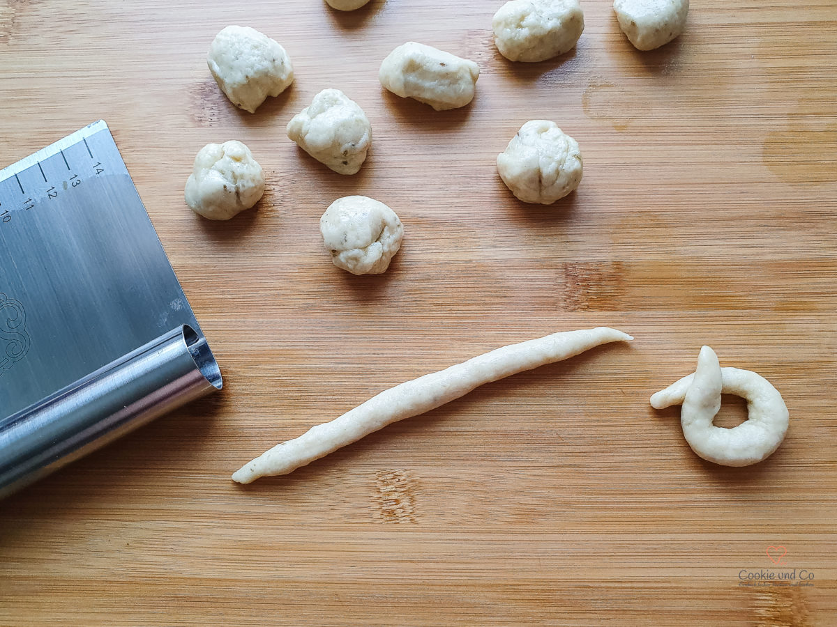 - Formen: Wer besonders präzise sein möchte, wiegt Teigstücke von je ca. 10 g ab. (Ansonsten nach Gefühl aufteilen.)Aus jedem Stück mindestens 10 cm lange Stränge rollen.Diese werden um zwei Finger gelegt, sodass sich der Kringel bildet. Etwas festdrücken, damit der Kringel nicht aufgeht. Danach auf ein Geschirrtuch legen.