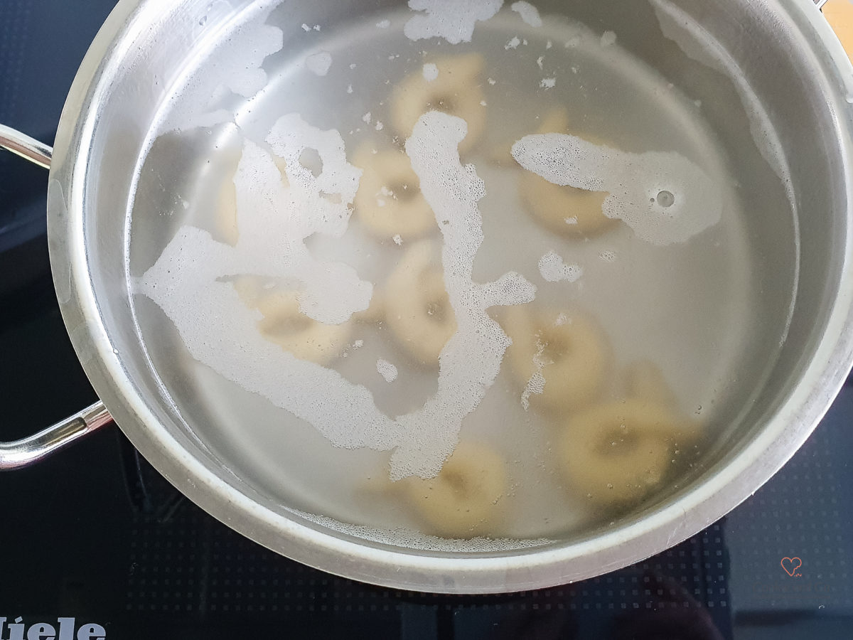 - Einen großen Topf mit Wasser zum Kochen bringen. Anschließend die Hitze reduzieren.Die Taralli portionsweise (immer ca. 10 Stück je nach Topfgröße) ins heiße Wasser geben. Das Wasser sollte dabei nicht kochen (ähnlich wie bei Klößen.)Wenn die Teigkringel an der Oberfläche schwimmen, mit einer Schaumkelle herausnehmen. Danach auf einem sauberen Geschirrtuch abtropfen lassen. (Ggf. kurz in Sesam wälzen.)