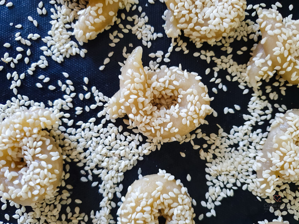 Das Rezept lebt sozusagen von wenigen guten Zutaten. Gutes Mehl, sehr gutes und möglichst frisches Olivenöl und natürlich guter Wein. Ich nahm hierzu original italienisches Pizzamehl, aromatisches Olivenöl sowie einen hervorragenden Bio Rosé. Der Rest (neben den drei Hauptzutaten) ist sozusagen Geschmackssache. Ganz traditionell kommt gemörserter Fenchel in den Teig. Dies hat uns erstaunlich gut geschmeckt – sogar den Kids (man höre und staune!). Aber auch Rosmarin, Sesam, Knoblauch, Chili, Anis oder Pfeffer machen sich besonders gut. Ganz pur ohne alles geht natürlich auch. Der Hit war bei uns übrigens die Sesam-Variante. Dazu habe ich nicht nur etwas angerösteten Sesam in den Teig gegeben, sondern jeden Tarallo nach dem Kochen kurz in Sesam gewälzt. So bleibt dieser nämlich später prima kleben. Der Teig ergibt immerhin etwa 60 Taralli. Da bietet es sich einfach an, gleich mal verschiedenen Geschmacksrichtungen auszuprobieren. So ist für jeden in der Familie dann etwas dabei.