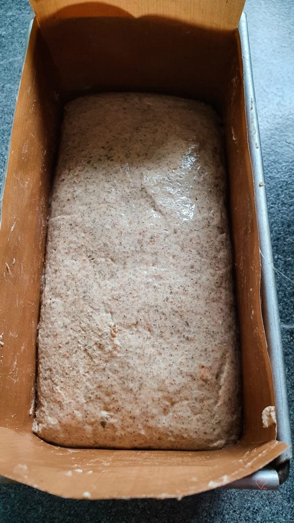 - Abgedeckt für 10−12 Stunden bei 22−24°C zur Gare stellen. Der Teig sollte zum Ende der Gehzeit zumindest knapp bis unter den Rand der Kastenform reichen. (Die Reifezeit hängt sehr stark vom Anstellgut ab, kann also auch kürzer oder länger dauern. Bei aufgefrischten Sauerteig oder extrem fitten Anstellgut dauert die Gare erfahrungsgemäß ca. 8 Stunden.)