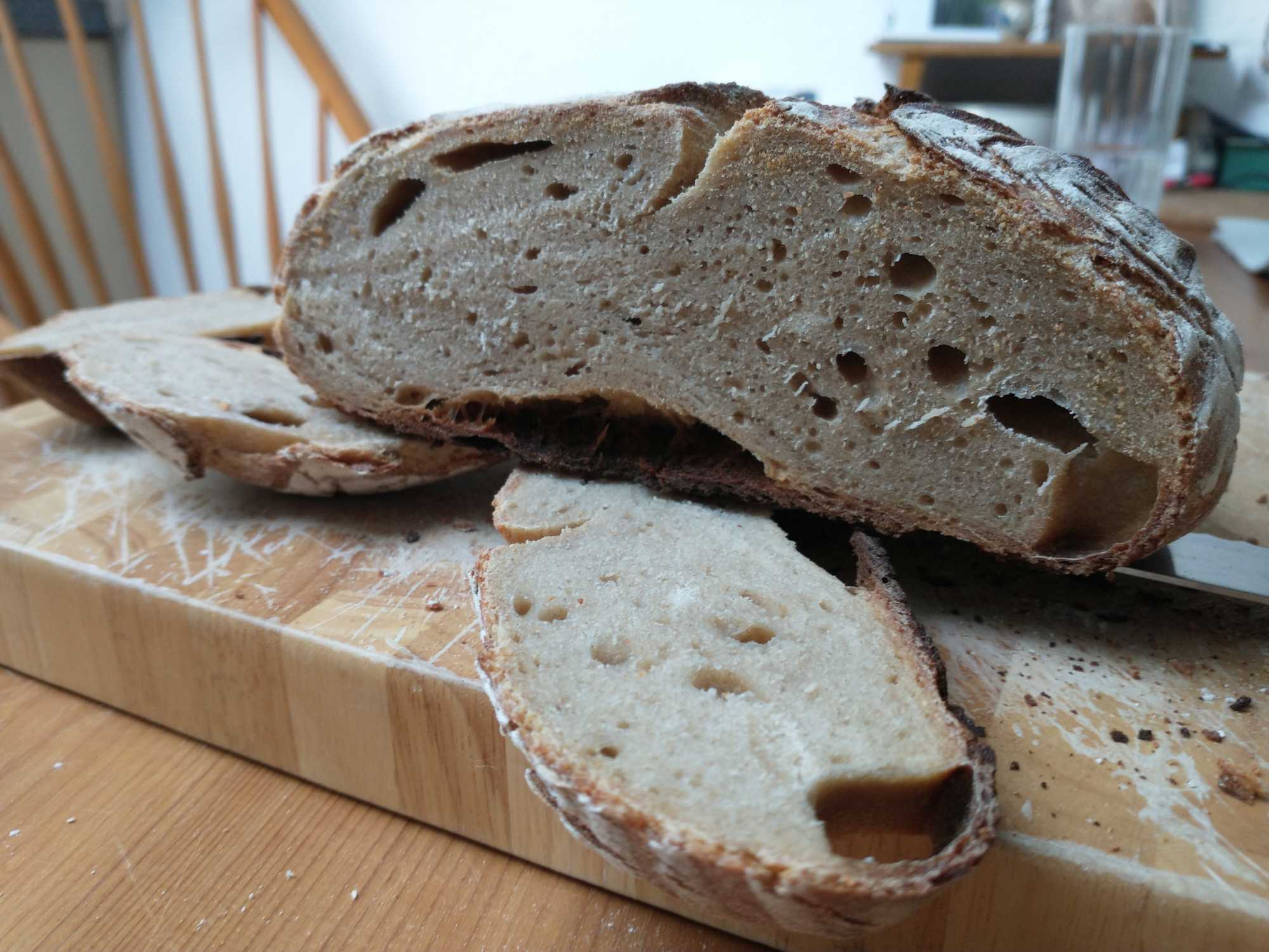 ich habe mich an diesem tollen Rezept versucht, auch da es ähnlich aufgebaut ist wie dein Hausbrot, das mir beim ersten Versuch etwas misslang. Ich habe etwas Schüttflüssigkeit zurückbehalten und so konnte ich den Teigling gut formen. Die Raumtemperatur war sehr hoch (ca. 27°C) und der Teig nach dem Handkneten auch schon bei 28°C. Ich habe deshalb für Stock- und Stückgare die Zeiten an der unteren Grenze genommen. Das Brot sieht von außen toll aus, die Kruste ist der Hammer. Mit der Krume bin ich weniger zufrieden; das Brot hat große Löcher, davon eines direkt am Boden, und die Krume ist relativ dicht geworden, dazu kommen so kleine „Krumenwürstchen“. Dies passiert mir häufiger mit Sauerteigbroten. Ein Bild habe ich angehängt. Kein Vergleich zu der Krume bei dir im Bild! Hätte ich die Gare doch etwas länger halten sollen, oder war es so warm, dass es schon eine Übergare war? Kannst du es vom Bild einschätzen? Danke für deine Tipps!
