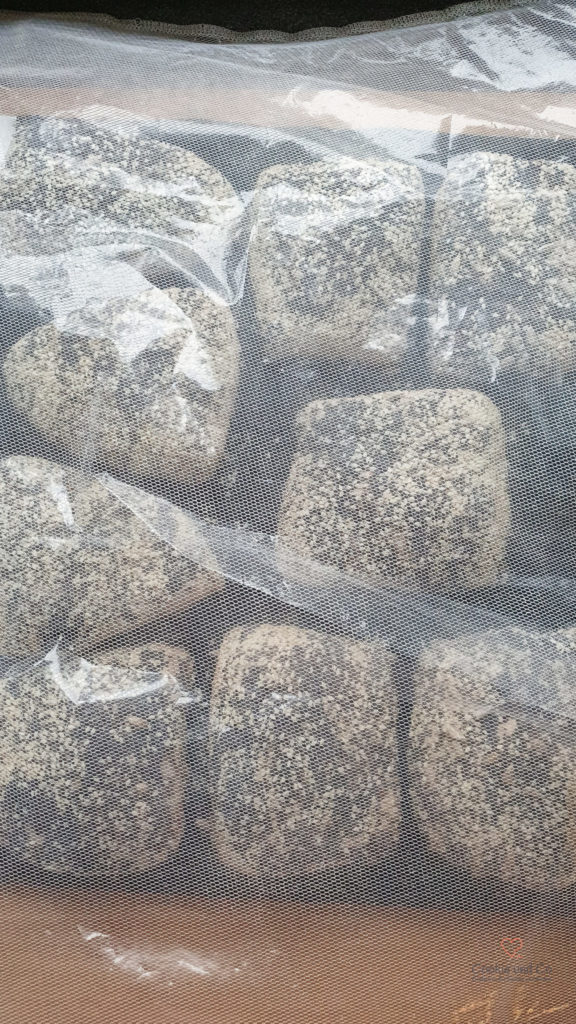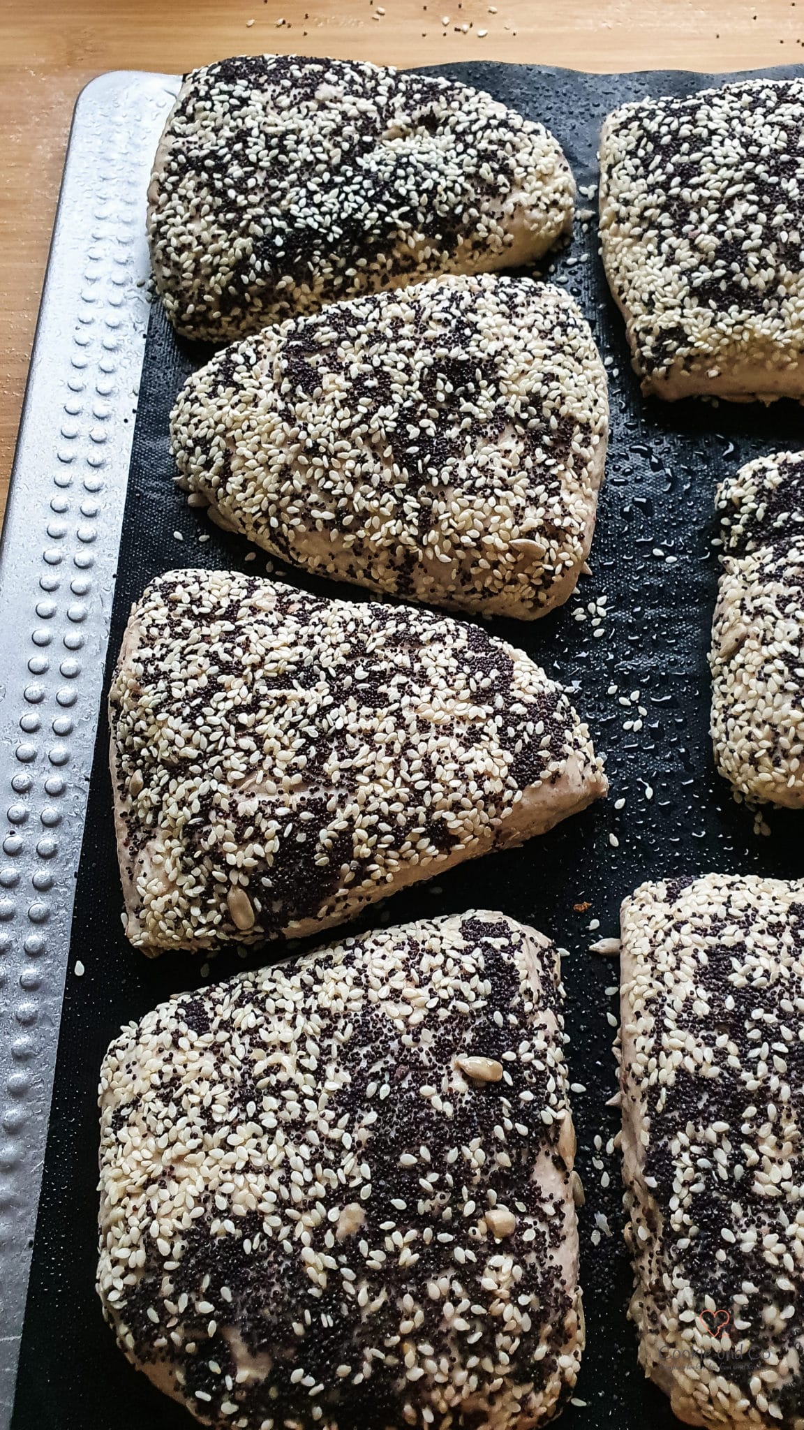 - Danach die andere Seite ebenfalls anfeuchten und in die Seite in Sesam-Mohn-Mischung drücken.
