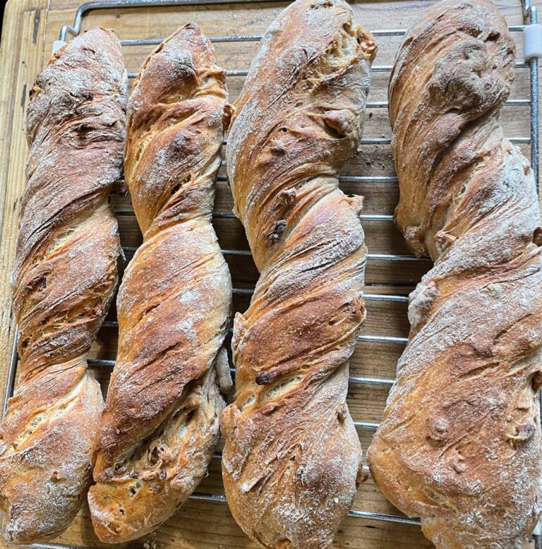 Ganz leckere, einfach zu backende Wurzelbrote! Ich habe den Teig halbiert , eine Hälfte mit Röstzwiebeln, in die andere Hälfte kamen Walnüsse( in unserem TK hat es noch ziemliche viele von der Ernte 2022) Eigentlich waren die Stangen für heute Mittag zum Apero gedacht, aber ein Walnussbrot hat den Weg auf den Frühstückstisch gefunden: ganz , ganz Fein! Vielen Dank liebe Sonja , für das tolle Rezept!